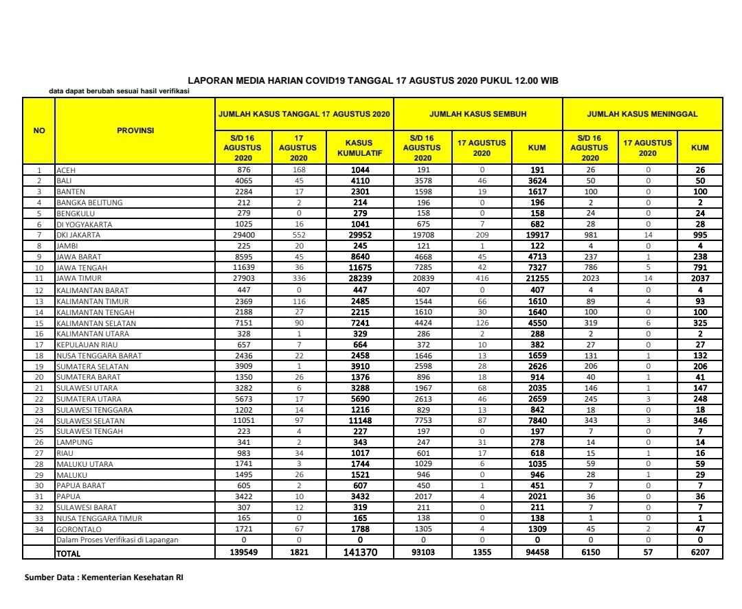 Berikut adalah data COVID-19 di seluruh provinsi pada tanggal 17 Agustus 2020: