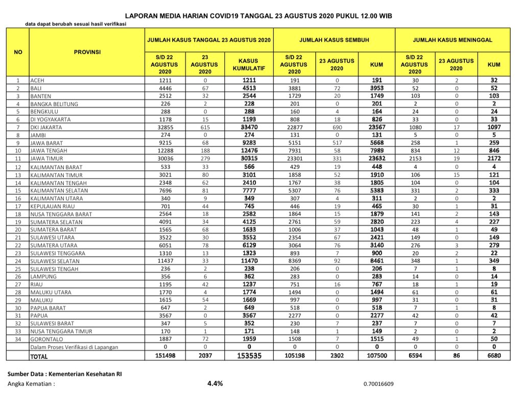 Berikut adalah data COVID-19 di seluruh provinsi pada tanggal 23 Agustus 2020: