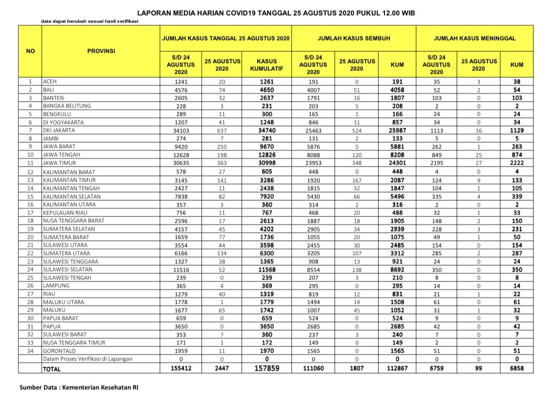 Berikut adalah data COVID-19 di seluruh provinsi pada tanggal 25 Agustus 2020:
