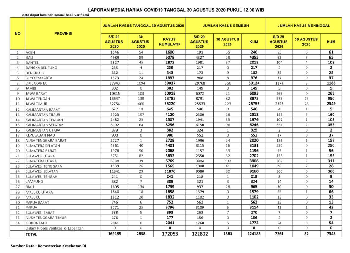 Berikut adalah data COVID-19 di seluruh provinsi pada tanggal 30 Agustus 2020: