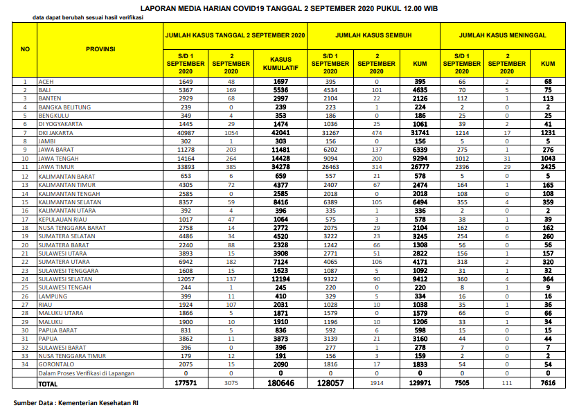 Berikut adalah data COVID-19 di seluruh provinsi pada tanggal 2 September 2020: