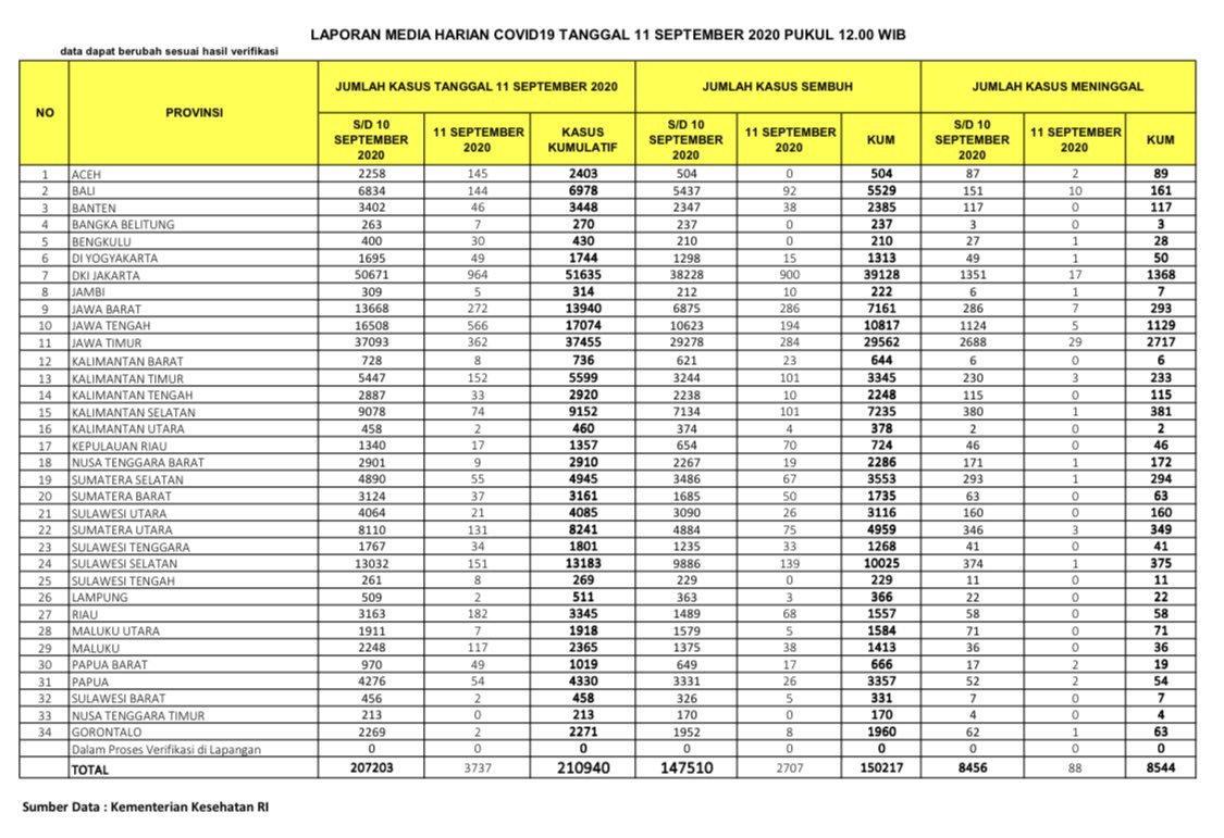 Berikut adalah data COVID-19 di seluruh provinsi pada tanggal 11 September 2020: