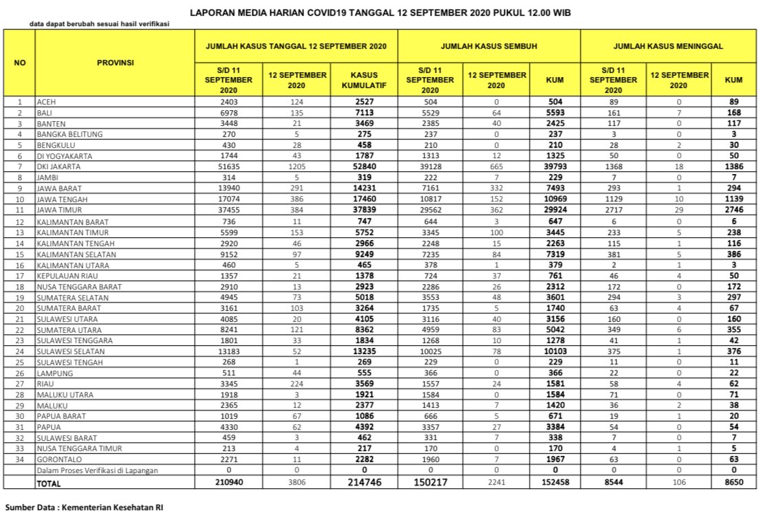 Berikut adalah data COVID-19 di seluruh provinsi pada tanggal 12 September 2020: