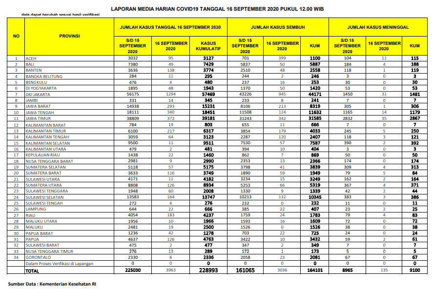 Berikut adalah data COVID-19 di seluruh provinsi pada tanggal 16 September 2020: