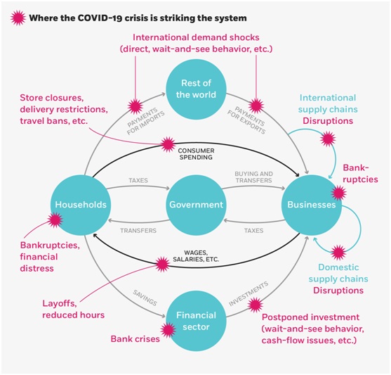 Penurunan permintaan dan/atau guncangan pasokan langsung dapat menyebabkan gangguan pada rantai pasokan internasional dan domestik. Keduanya menyebabkan penurunan lebih lanjut dalam output — terutama di sektor manufaktur. Pukulan terhadap manufaktur dapat dibesar-besarkan oleh wait-and-see behavior dari orang dan perusahaan.