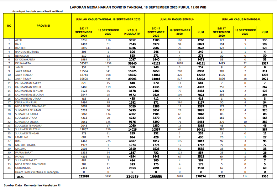 Berikut adalah data COVID-19 di seluruh provinsi pada tanggal 18 September 2020: