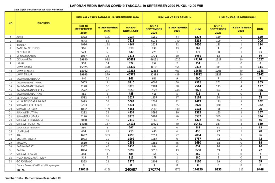 Berikut adalah data COVID-19 di seluruh provinsi pada tanggal 19 September 2020: