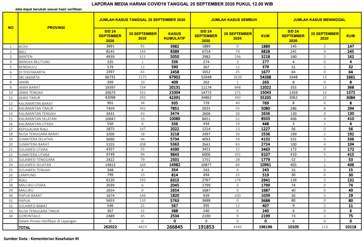 Berikut adalah data COVID-19 di seluruh provinsi pada tanggal 25 September 2020: