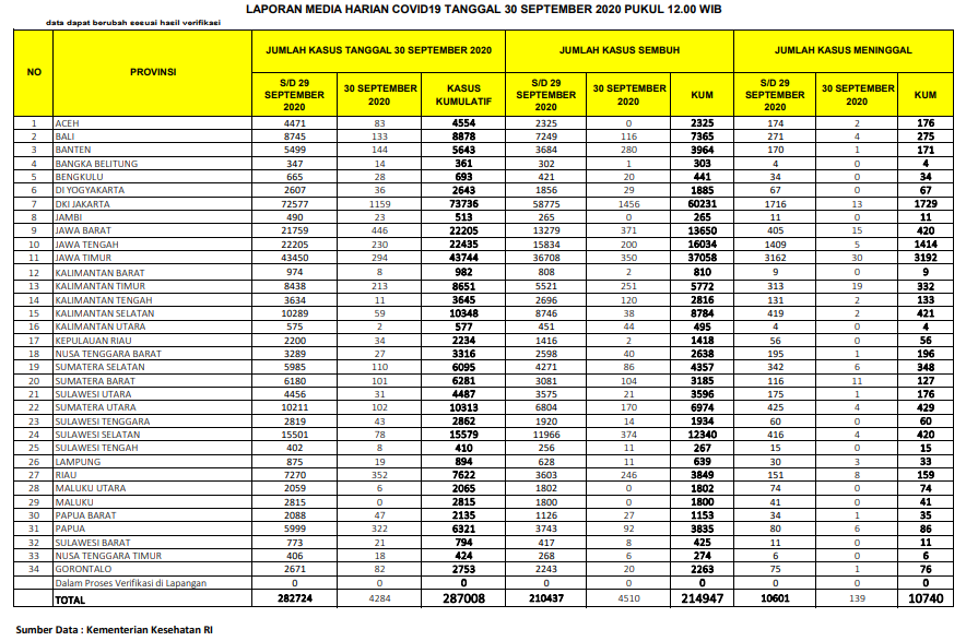 Berikut adalah data COVID-19 di seluruh provinsi pada tanggal 30 September 2020: