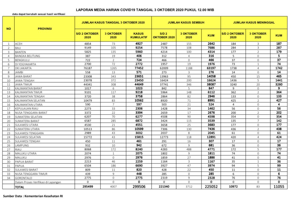 Berikut adalah data COVID-19 di seluruh provinsi pada tanggal 3 Oktober 2020: