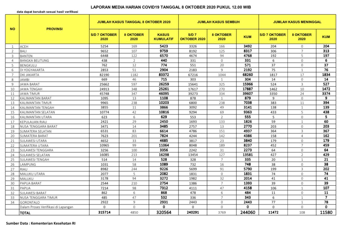 Berikut adalah data COVID-19 di seluruh provinsi pada tanggal 8 Oktober 2020: