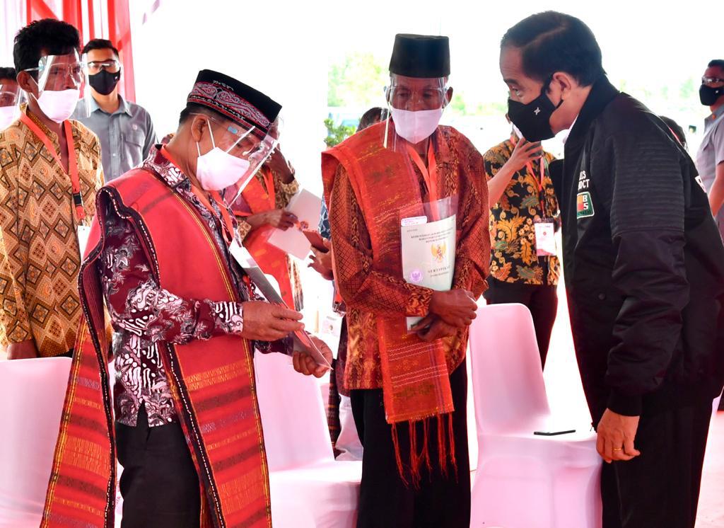 Presiden Joko Widodo menyerahkan sertifikat hak atas untuk rakyat di Kabupaten Humbang Hasundutan, Sumatera Utara, pada Selasa, 27 Oktober 2020. FOTO: BIRO PERS SETPRES