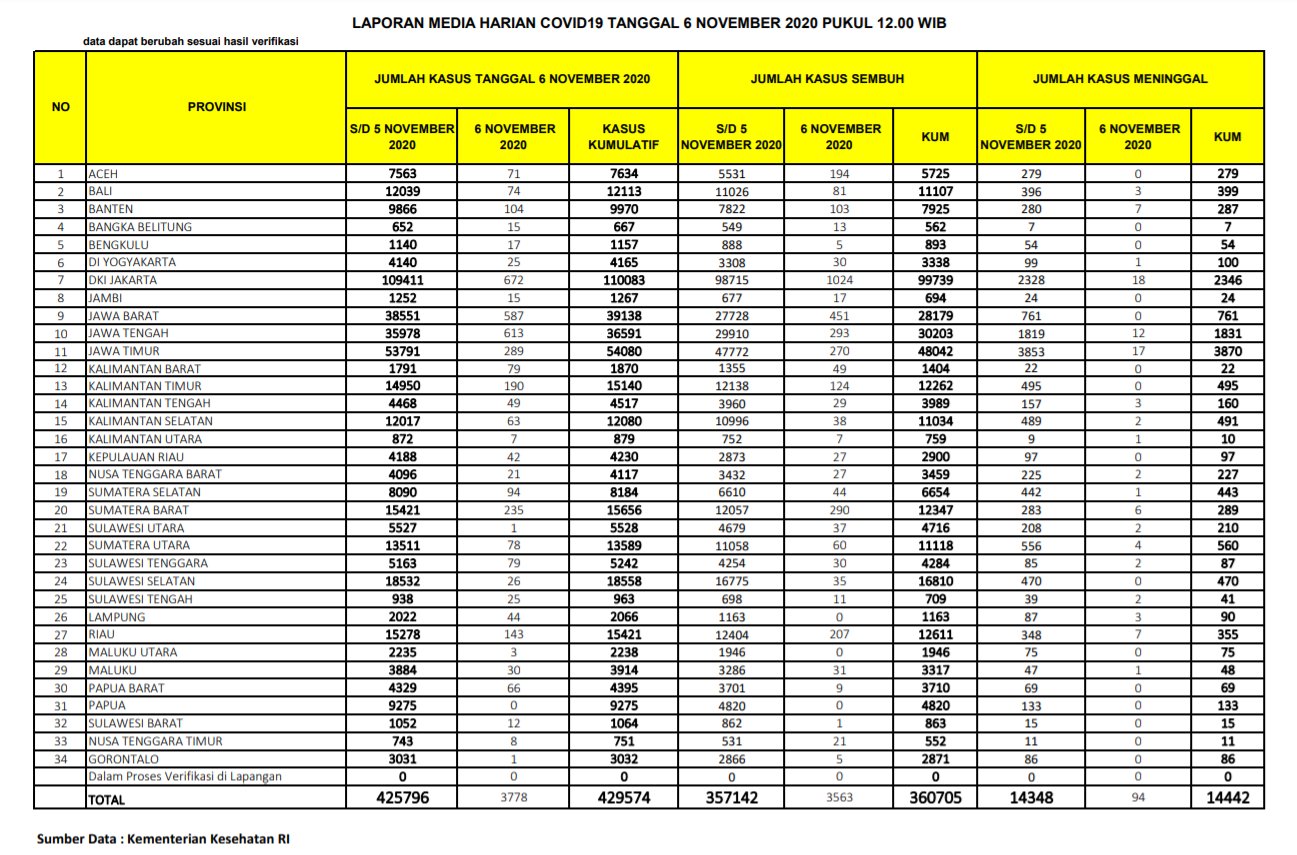 Berikut adalah data COVID-19 di seluruh provinsi pada tanggal 6 November 2020: