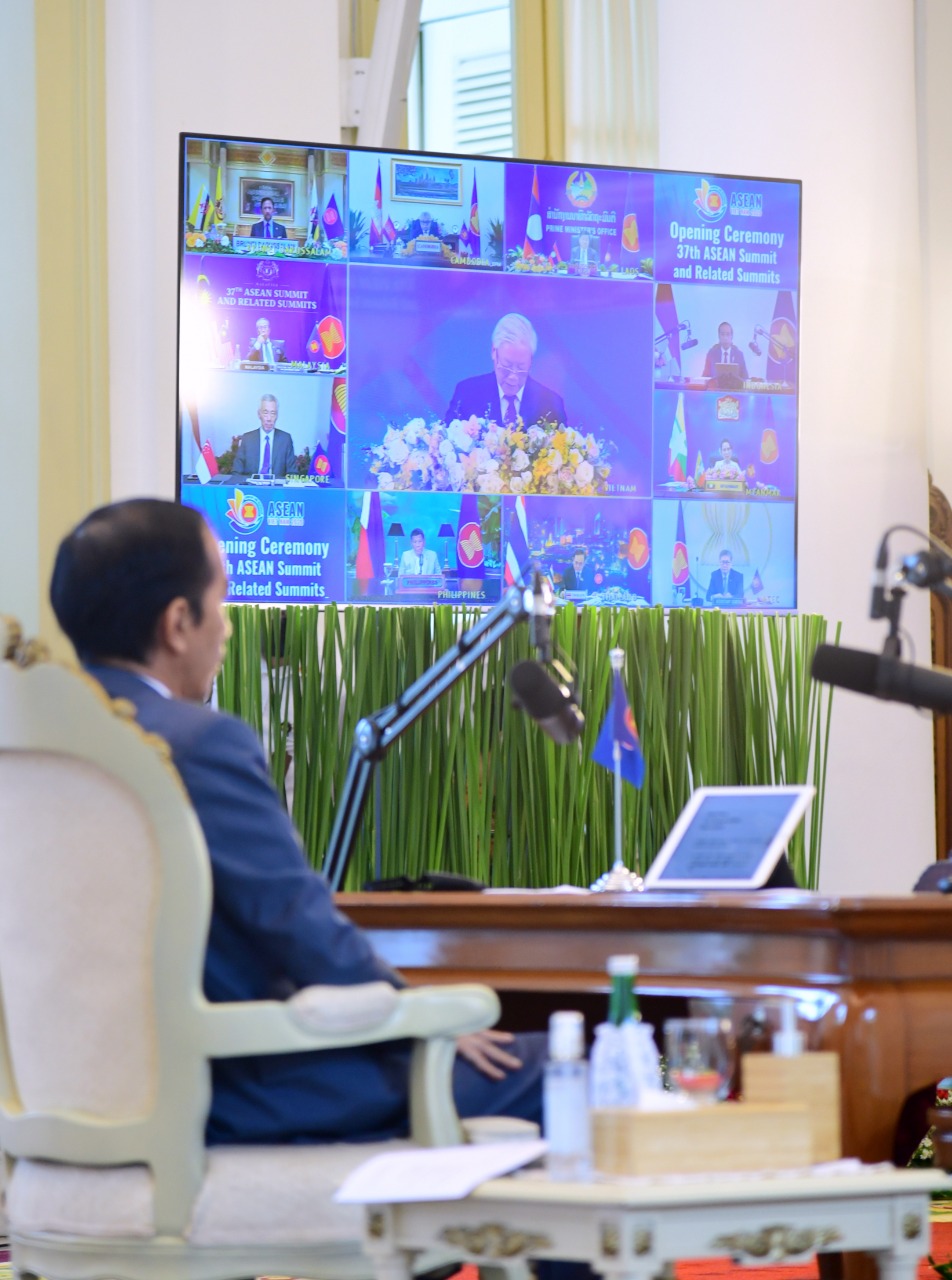 (Vibizmedia-Nasional) Presiden Joko Widodo menghadiri rangkaian Konferensi Tingkat Tinggi (KTT) ke-37 ASEAN secara virtual melalui konferensi video dari Istana Kepresidenan Bogor, Jawa Barat, pada Kamis, 12 November 2020. Pada KTT kali ini, Vietnam bertindak selaku tuan rumah.