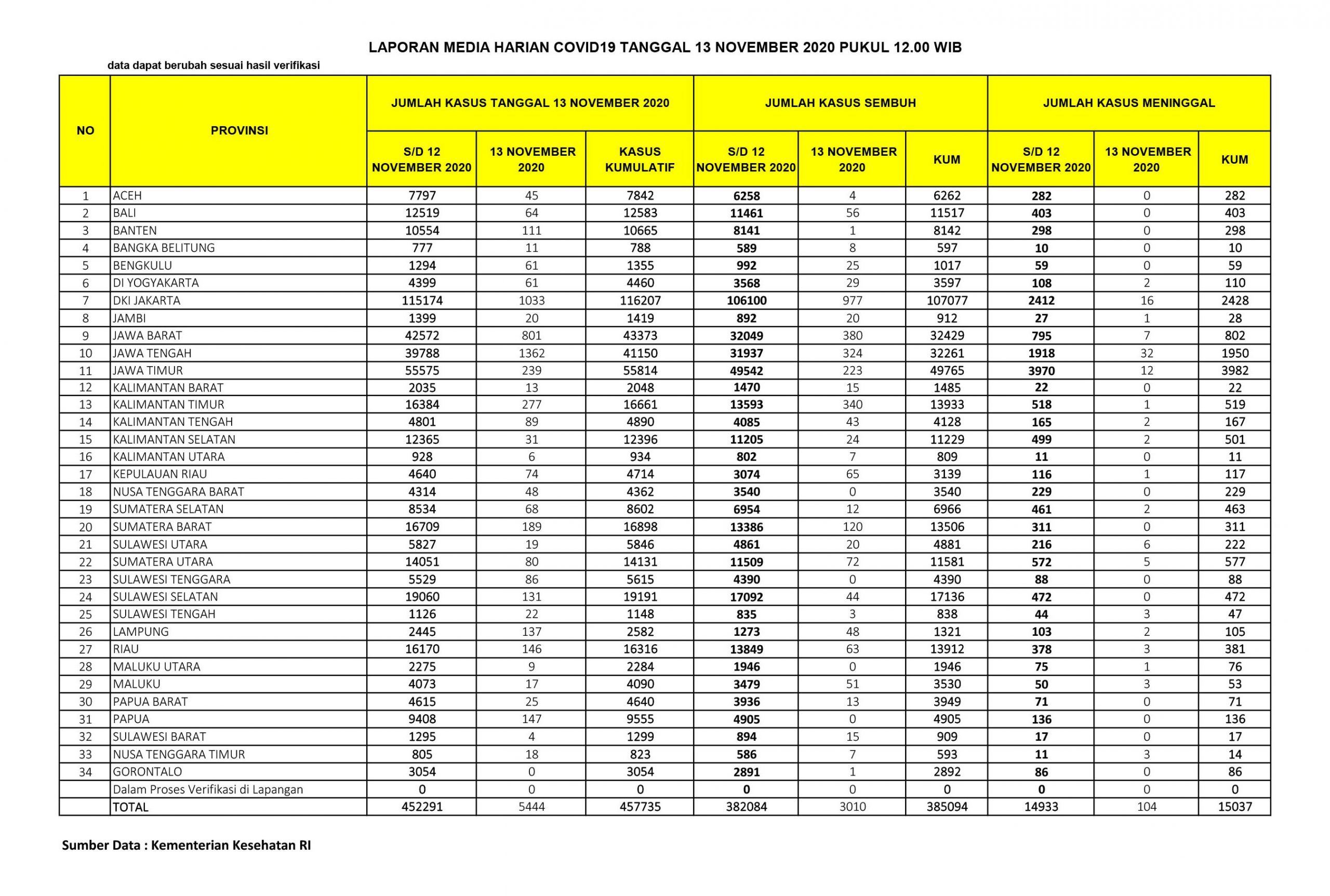Berikut adalah data COVID-19 di seluruh provinsi pada tanggal 13 November 2020: