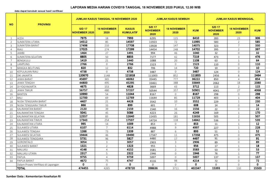 Berikut adalah data COVID-19 di seluruh provinsi pada tanggal 18 November 2020:
