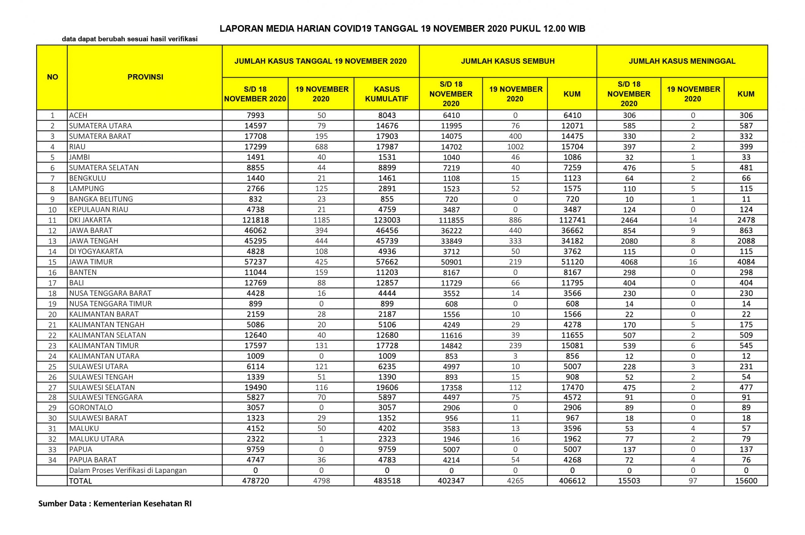 Berikut adalah data COVID-19 di seluruh provinsi pada tanggal 19 November 2020: