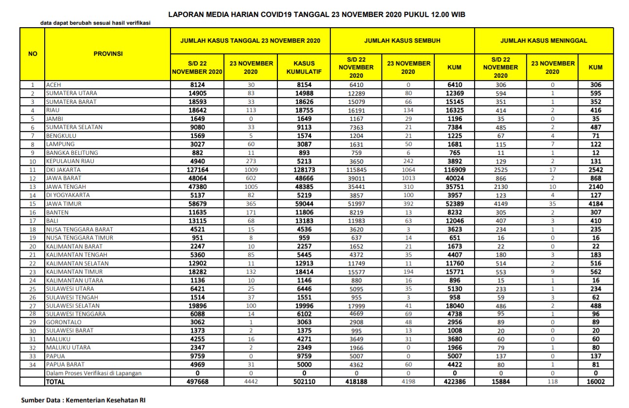 Berikut adalah data COVID-19 di seluruh provinsi pada tanggal 23 November 2020: