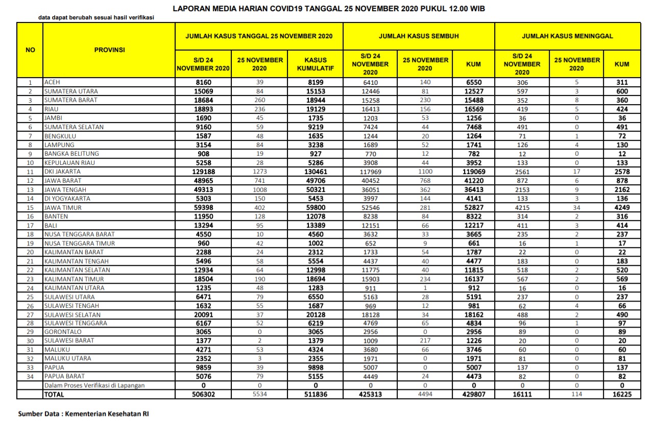Berikut adalah data COVID-19 di seluruh provinsi pada tanggal 25 November 2020: