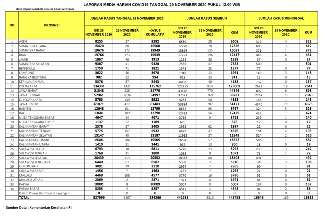 Berikut adalah data COVID-19 di seluruh provinsi pada tanggal 29 November 2020: