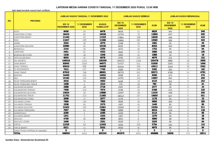 Berikut adalah data COVID-19 di seluruh provinsi pada tanggal 11 Desember 2020:
