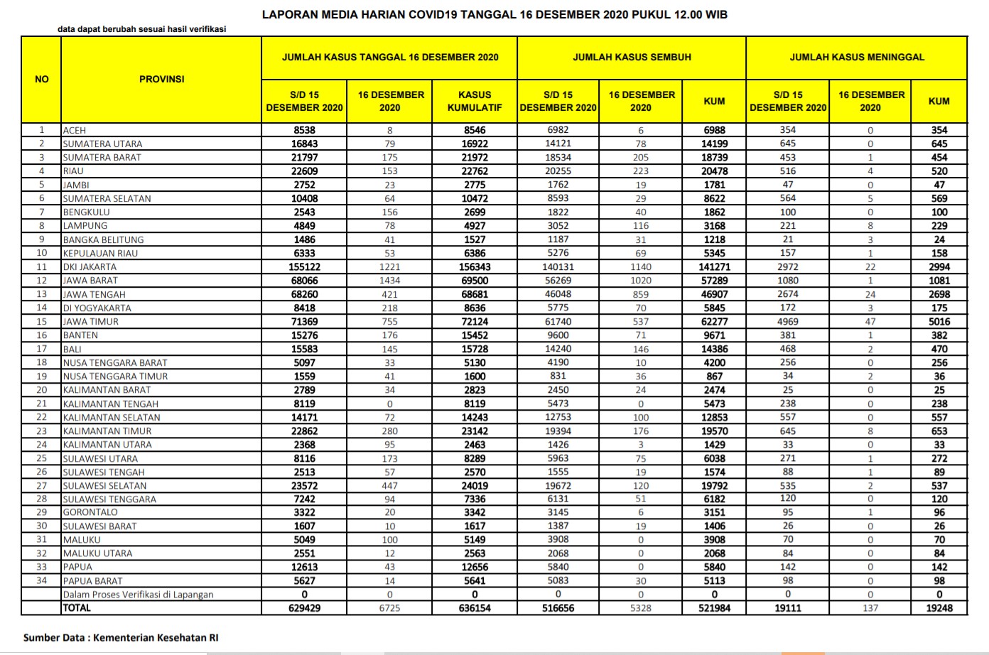 Berikut adalah data COVID-19 di seluruh provinsi pada tanggal 16 Desember 2020: