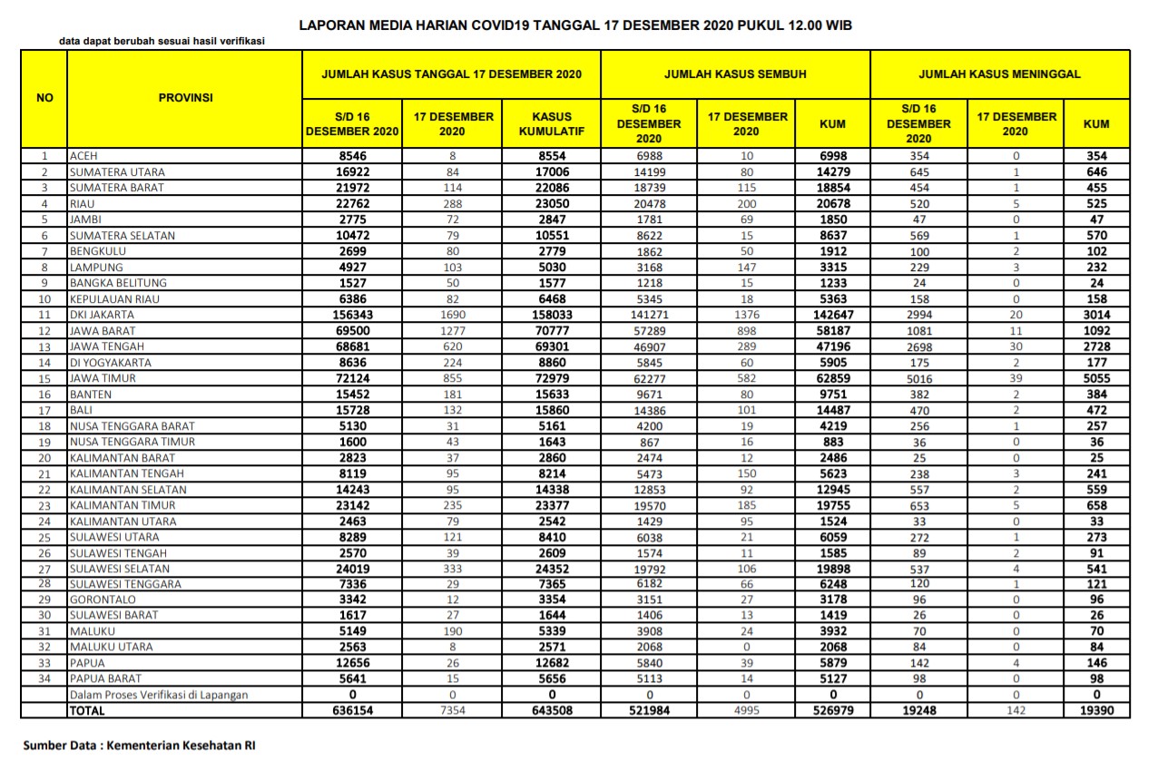 Berikut adalah data COVID-19 di seluruh provinsi pada tanggal 17 Desember 2020: