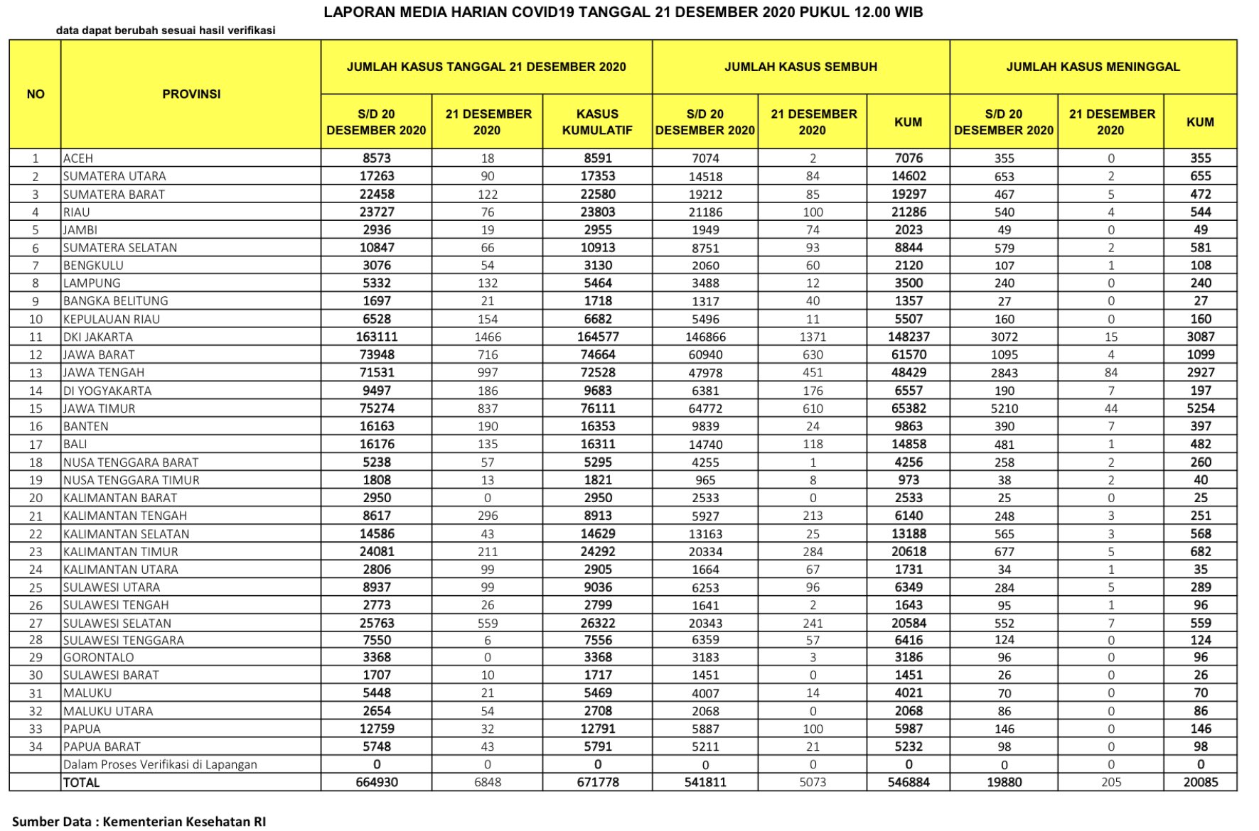 Berikut adalah data COVID-19 di seluruh provinsi pada tanggal 21 Desember 2020: