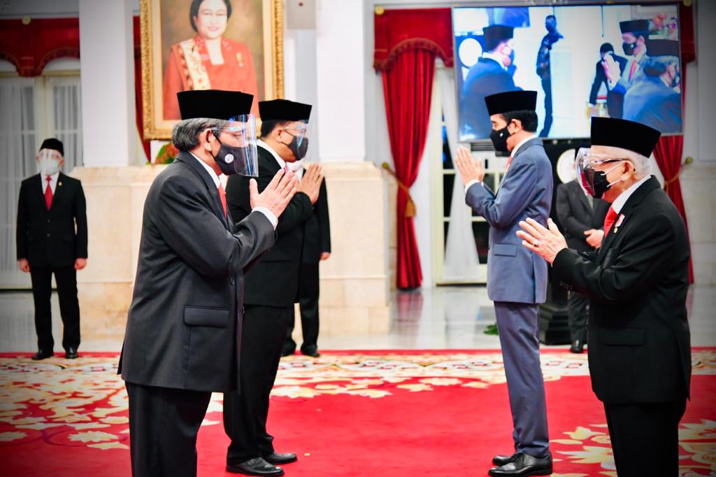 Presiden Joko Widodo melantik Irjen Pol. Dr. Petrus R. Golose sebagai Kepala Badan Narkotika Nasional dan Hartono sebagai Kepala Badan Restorasi Gambut dan Mangrove di Istana Negara, pada Rabu, 23 Desember 2020. FOTO: BIRO PERS SETPRES