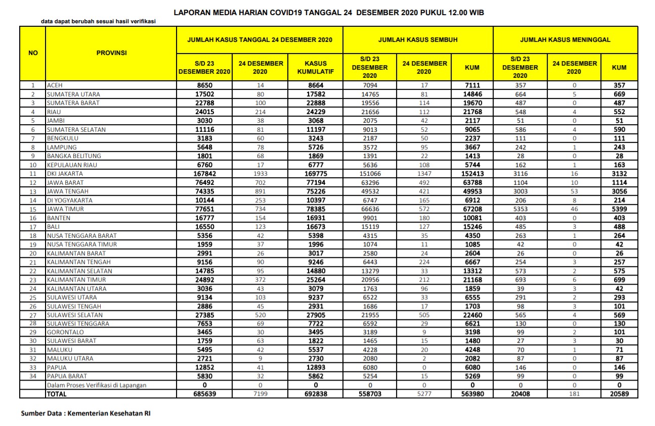 Berikut adalah data COVID-19 di seluruh provinsi pada tanggal 24 Desember 2020:
