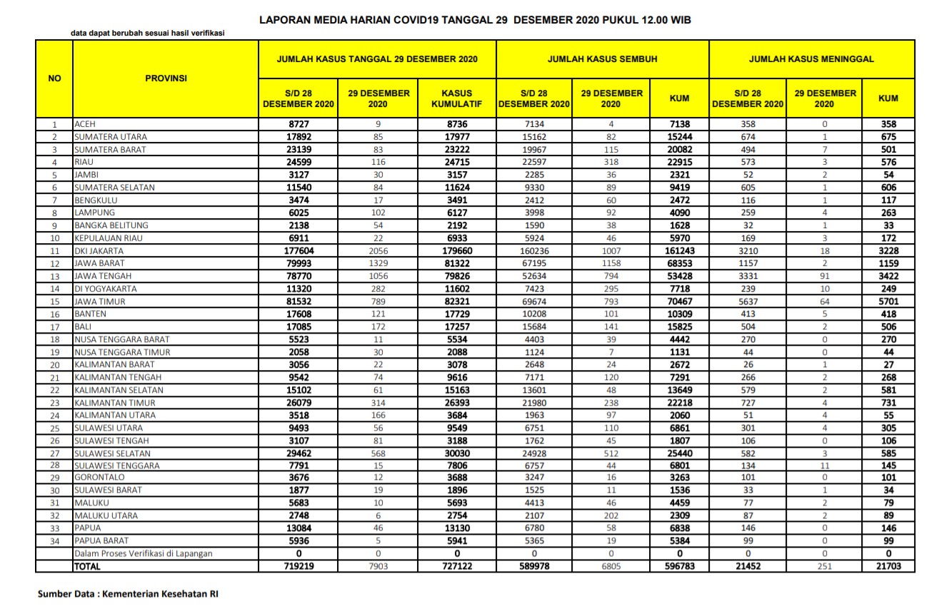 Berikut adalah data COVID-19 di seluruh provinsi pada tanggal 29 Desember 2020: