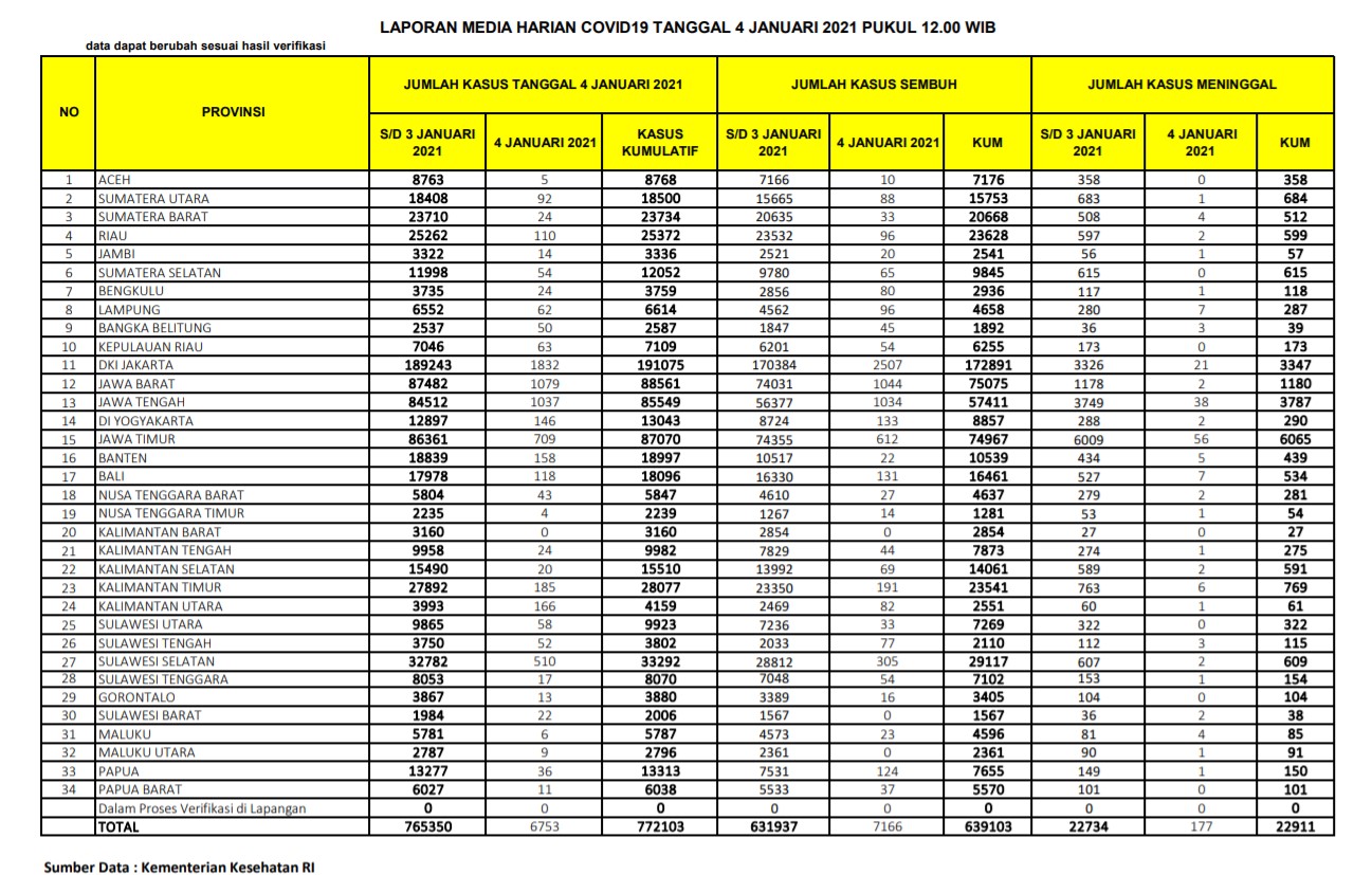 Berikut adalah data COVID-19 di seluruh provinsi pada tanggal 4 Januari 2021: