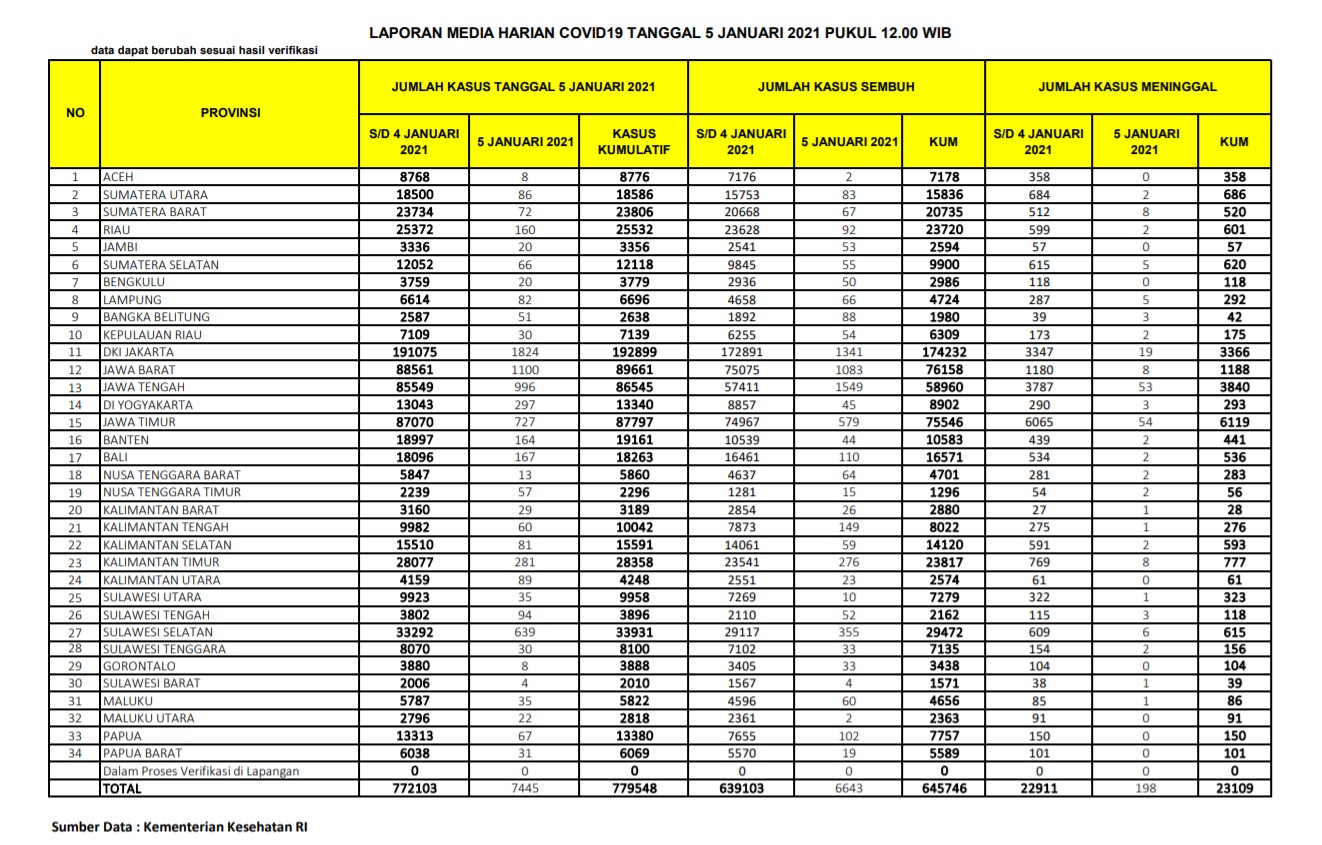 Berikut adalah data COVID-19 di seluruh provinsi pada tanggal 5 Januari 2021: