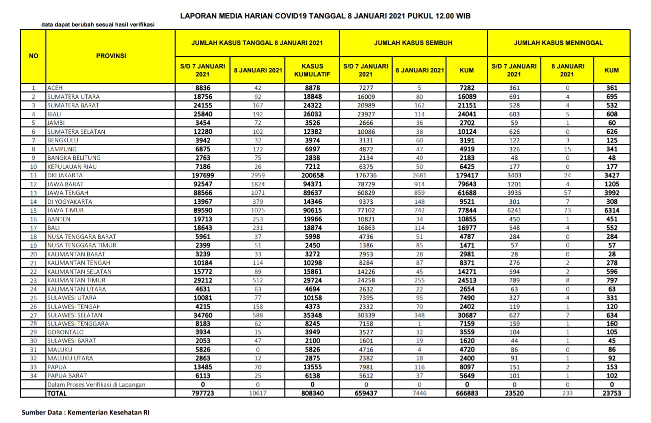 Berikut adalah data COVID-19 di seluruh provinsi pada tanggal 8 Januari 2021: