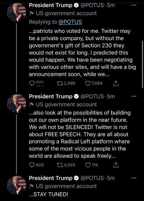 “… patriot yang memilih saya. Twitter mungkin perusahaan swasta, tetapi tanpa pemberian pemerintah Section 230 mereka tidak mungkin bertahan lama. Saya sudah memperkirakan ini akan terjadi. Kami telah bernegosiasi dengan berbagai situs lain, dan akan menyampaikan pengumuman besar dengan segera, sementara kita…