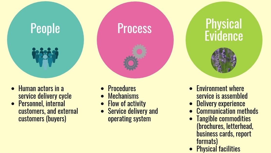 Physical Evidence, hal yang bersifat fisik seperti premises atau area pelayanan secara fisik, termasuk juga tangible commodities (brochures, letterhead, business cards, report formats) dan peralatan serta metode komunikasi dengan pelanggan.