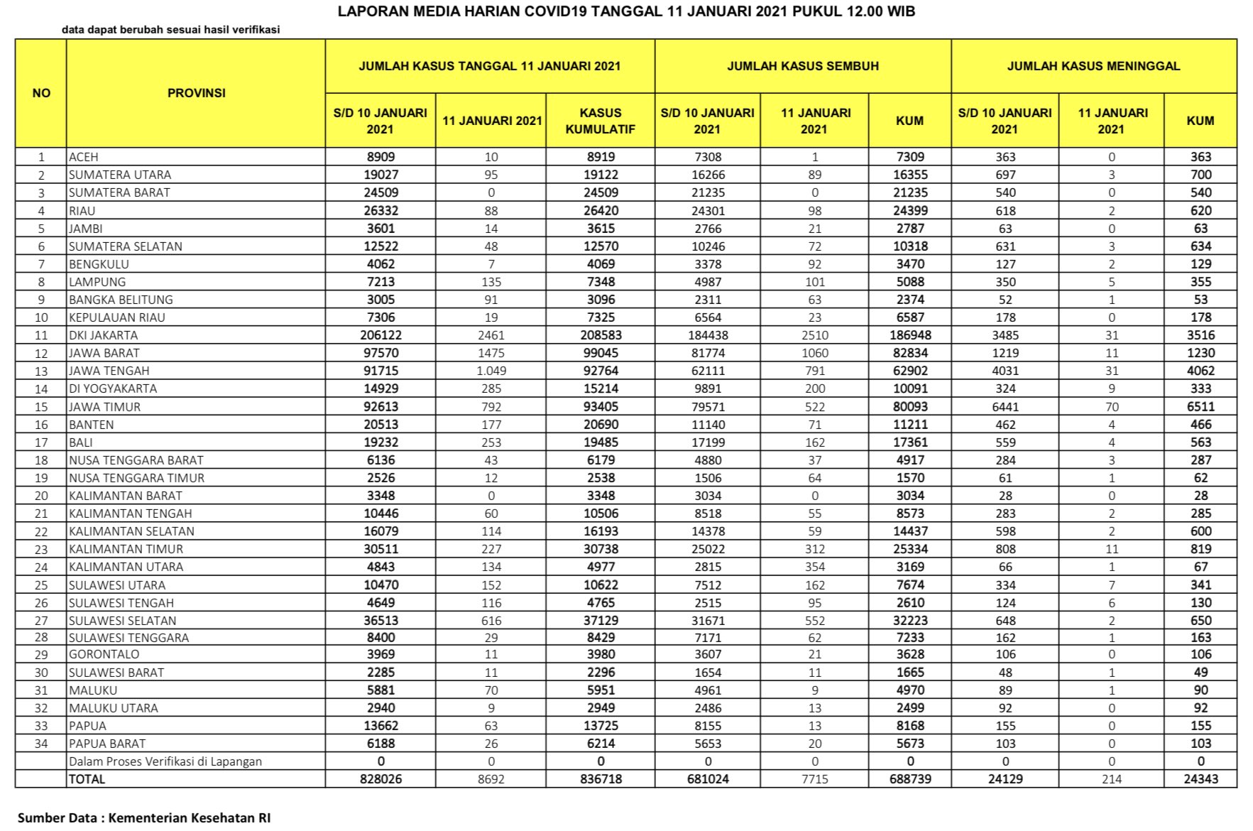 Berikut adalah data COVID-19 di seluruh provinsi pada tanggal 11 Januari 2021: