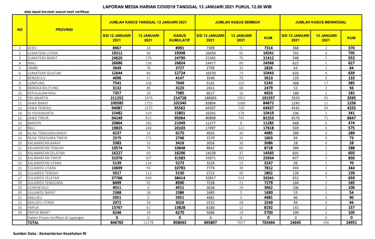 Berikut adalah data COVID-19 di seluruh provinsi pada tanggal 13 Januari 2021:
