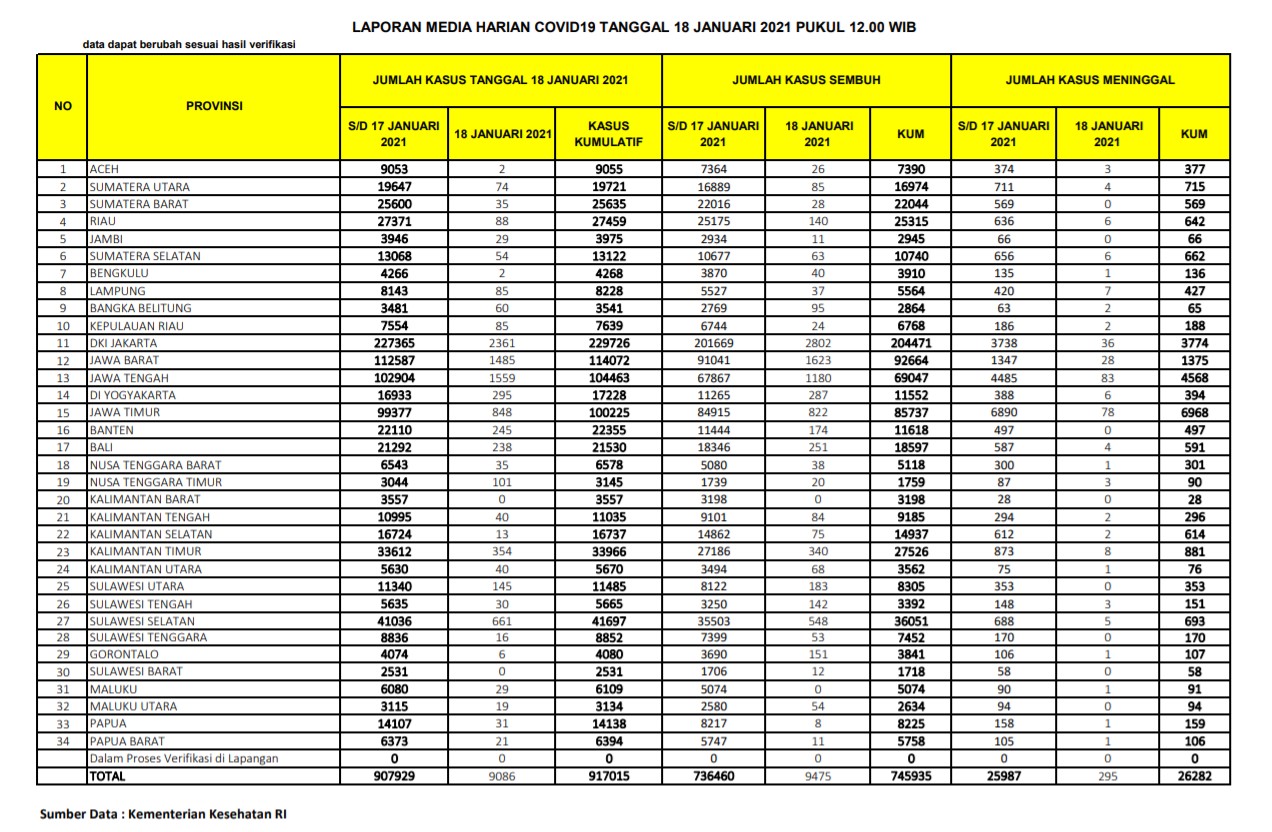 Berikut rincian kasus positif per provinsi per tanggal 18 Januari 2021