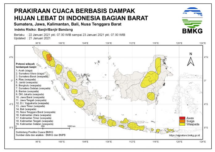 (Vibizmedia-Nasional) Badan Meteorologi, Klimatologi, dan Geofisika (BMKG) memprediksikan Wilayah Aceh dan Sumatera Utara (Sumut) berada pada kategori siaga terhadap potensi terdampak banjir dan banjir bandang. Kondisi ini berlaku pada 22 Januari 2021, pukul 07.00 WIB sampai dengan 23 Januari 2021, pukul 07.00 WIB.