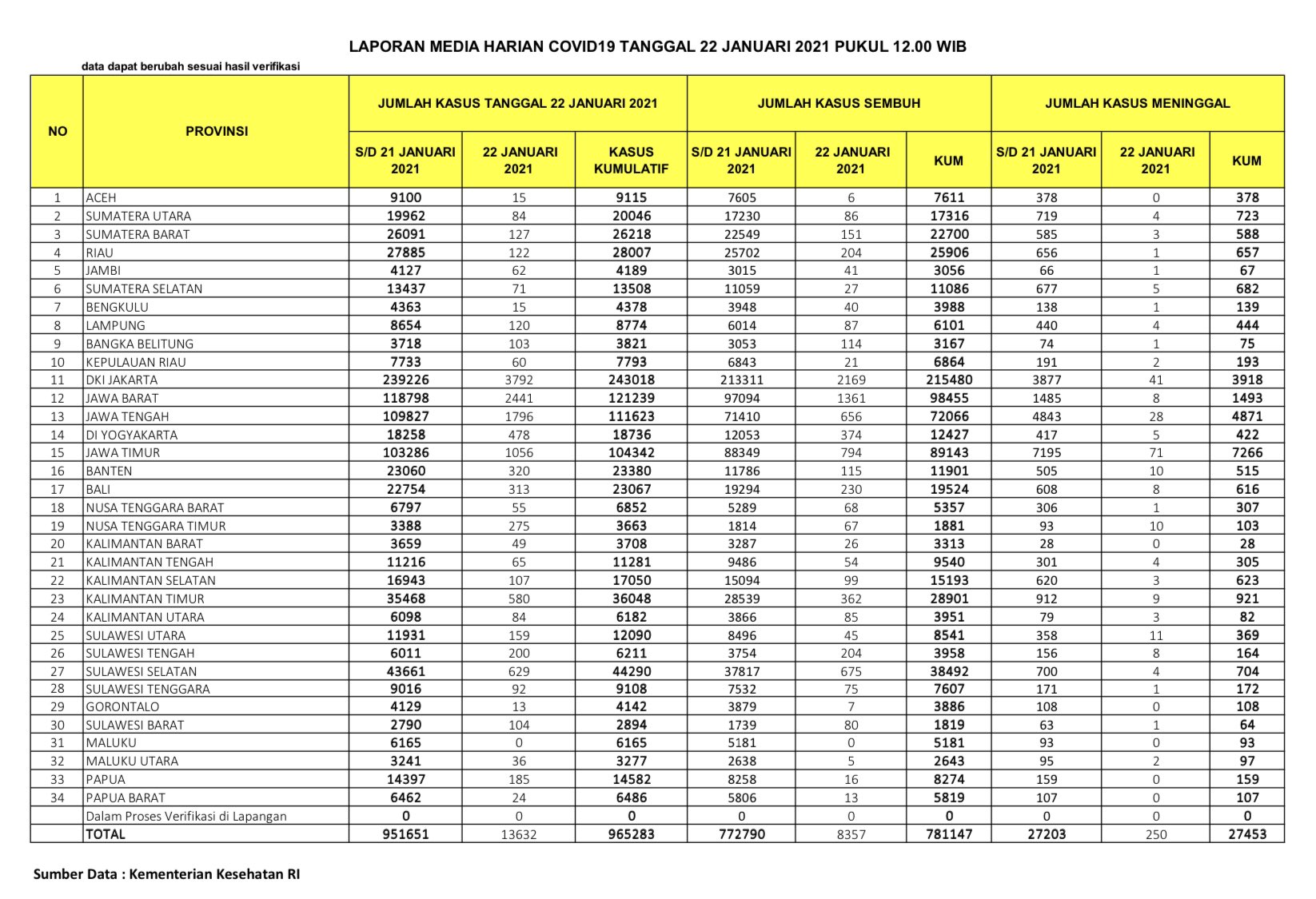 Berikut rincian kasus positif per provinsi per tanggal 22 Januari 2021