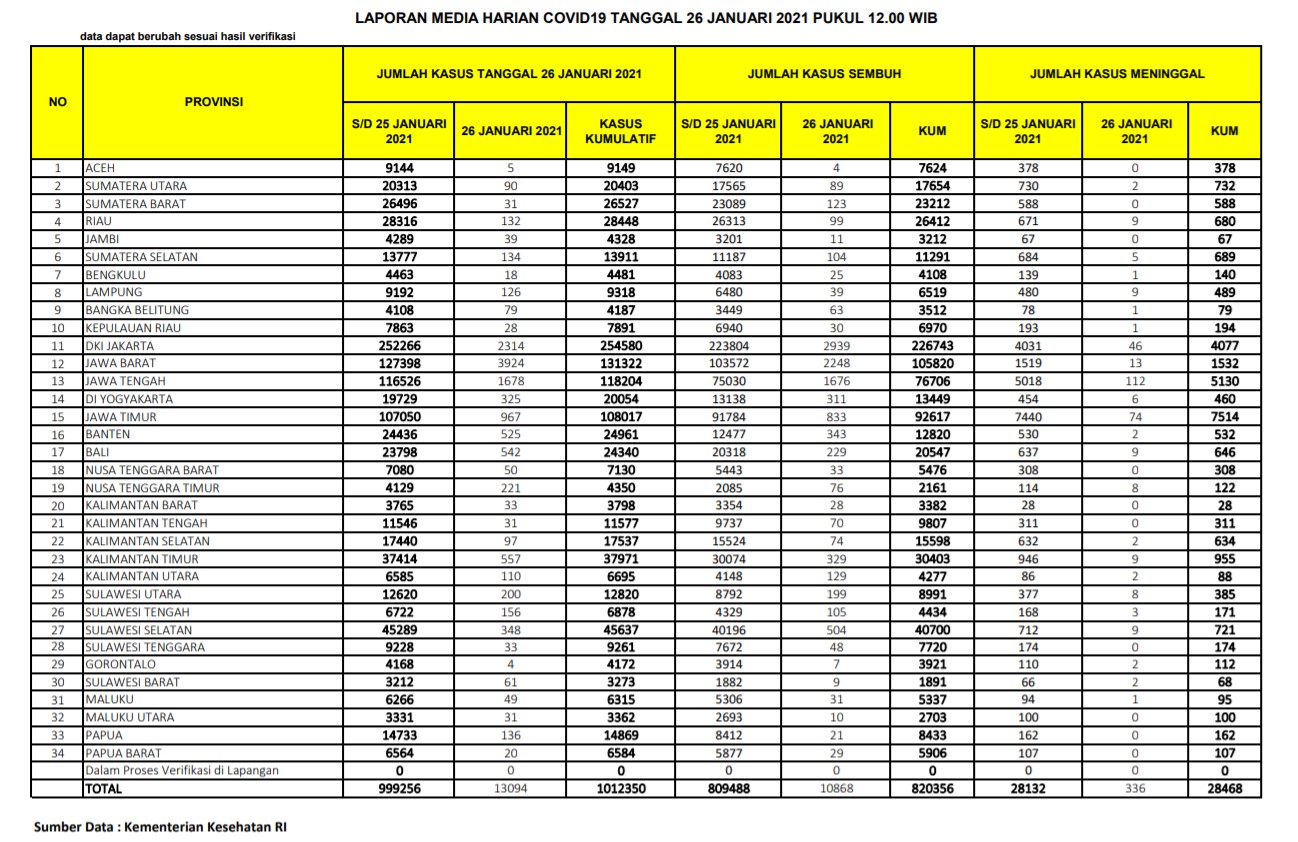 Berikut rincian kasus positif per provinsi per tanggal 26 Januari 2021