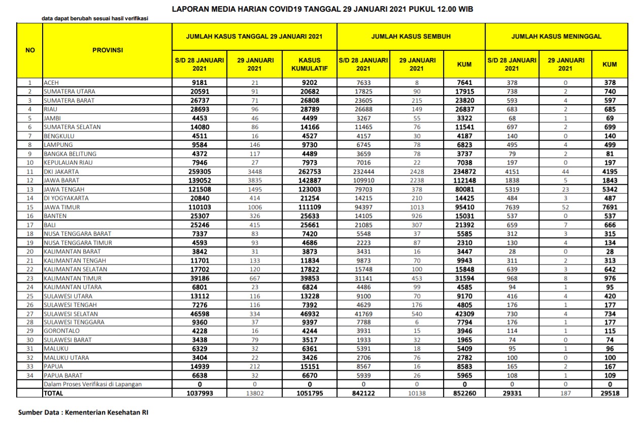 Berikut adalah data COVID-19 di seluruh provinsi pada tanggal 29 Januari 2021: