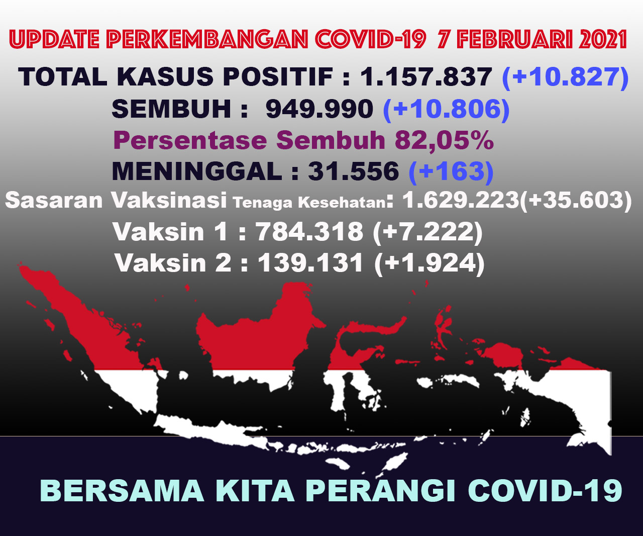 (Vibizmedia – Nasional) Berikut adalah angka akumulatif perkembangan data kasus Covid-19 dari seluruh Indonesia hingga tanggal 7  Februari 2021.