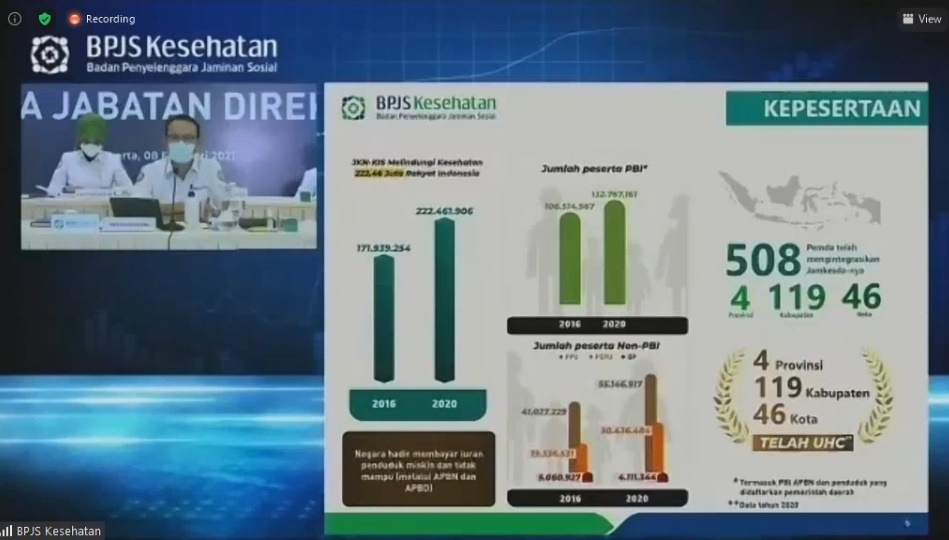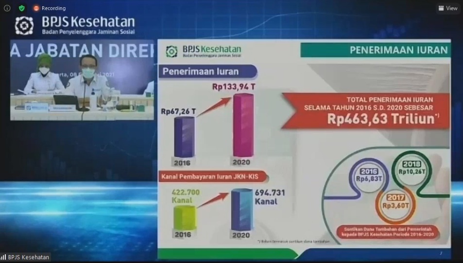 (Vibizmedia – Jakarta) Pemerintah dan BPJS Kesehatan telah berupaya memastikan kecukupan pembiayaan Program JKN-KIS. Hal ini dilakukan agar melalui program ini masyarakat tidak terhambat dalam mengakses layanan kesehatan. Sampai dengan akhir tahun 2020, pendanaan program ini terhitung cukup bahkan cashflow/arus kas DJS Kesehatan mulai surplus dan kondisi keuangan berangsur sehat karena jumlah peserta yang meningkat sampai akhir tahun 2020 sebanyak 222.461.906 orang sehingga penerimaan iuran dari Rp67,26 triliun pada tahun 2016 menjadi Rp133,94 triliun pada akhir tahun 2020, kata Direktur Utama BPJS Kesehatan, Fachmi Idris dalam Public Expose Tahunan Direksi BPJS Kesehatan (Tahun 2021) yang dilakukan secara online melalui aplikasi zoom, Senin (8/02/2021)