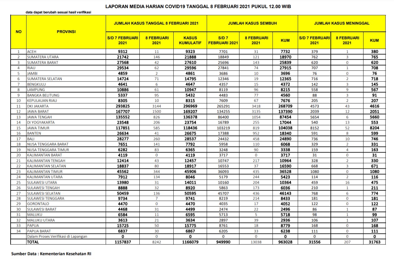 Berikut adalah data COVID-19 di seluruh provinsi pada tanggal 8 Februari 2021: