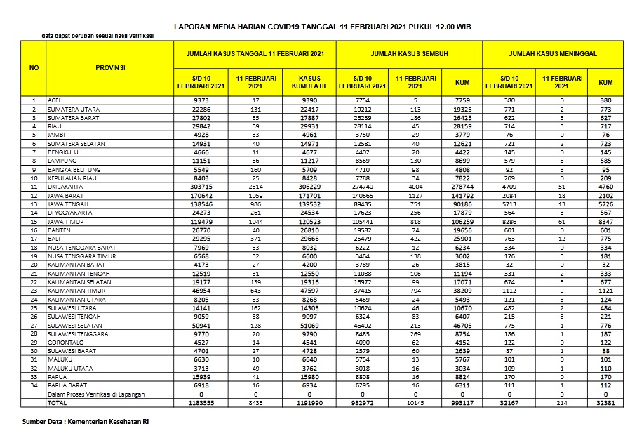 Berikut adalah data COVID-19 di seluruh provinsi pada tanggal 11 Februari 2021: