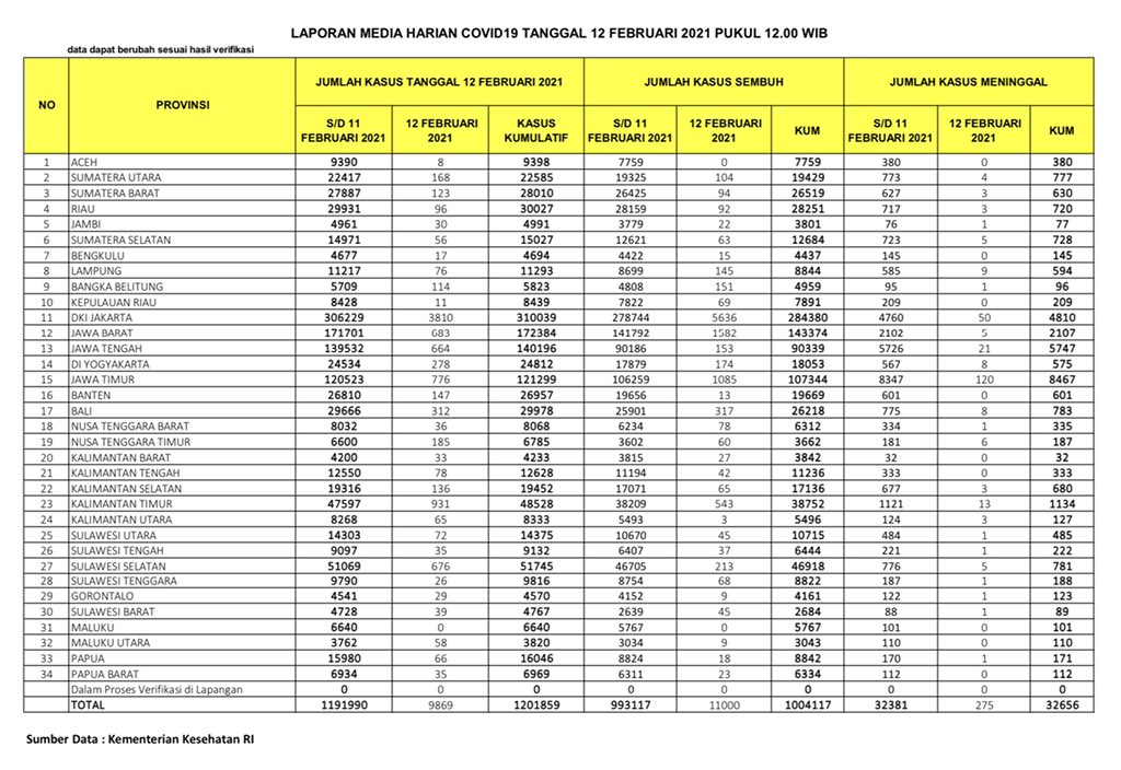 Berikut rincian kasus positif per provinsi per tanggal 12 Februari 2021: