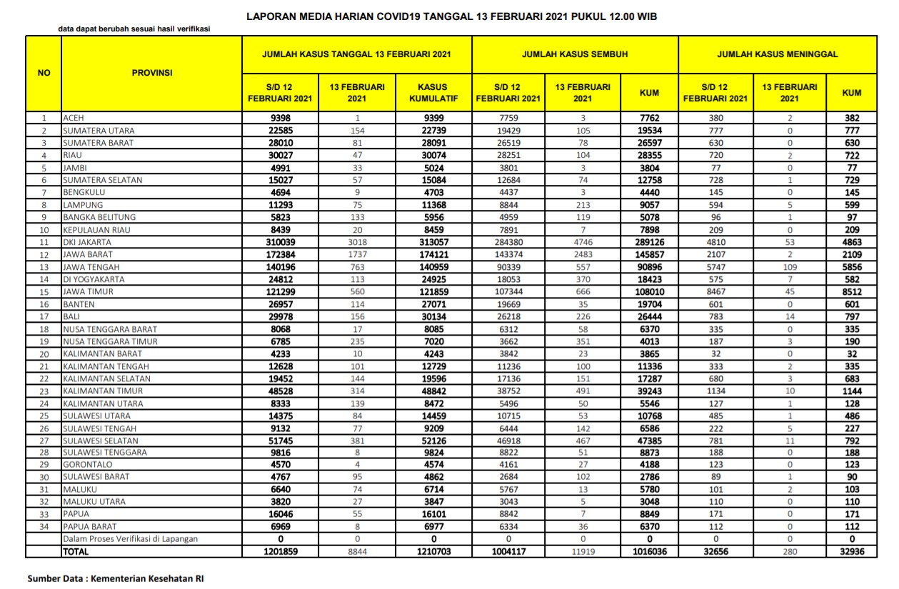 Berikut rincian kasus positif per provinsi per tanggal 13 Februari 2021: