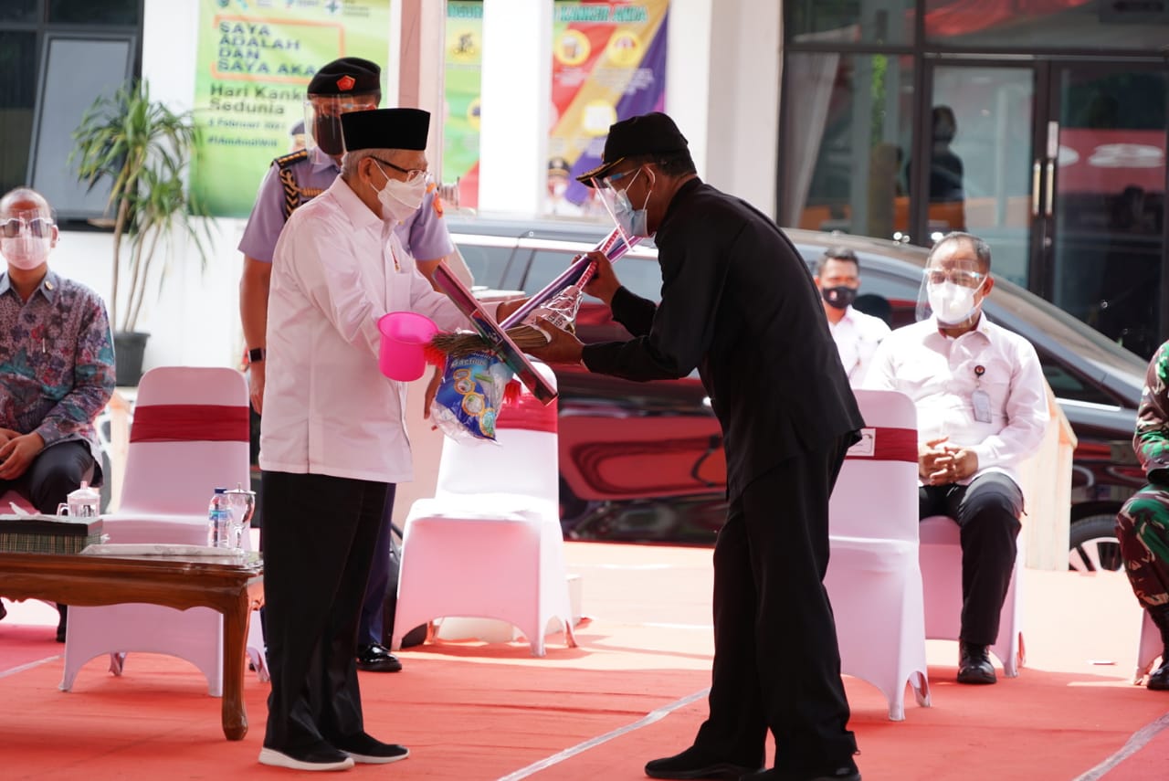 Pertama, secara simbolis ia menyerahkan bantuan dari Presiden, yaitu 1.500 paket sembako, berupa beras, minyak, teh, gula, dan masker. Kedua, Wapres menyerahkan bantuan berupa 200 paket alat kebersihan, dukungan dari Kementerian Sosial. Dan yang ketiga, Wapres menyerahkan bantuan berupa 10.000 alat rapid test, 300.000 masker, 5.000 sarung, dan 1.000 matras, dukungan dari Badan Nasional Penanggulangan Bencana (BNPB).